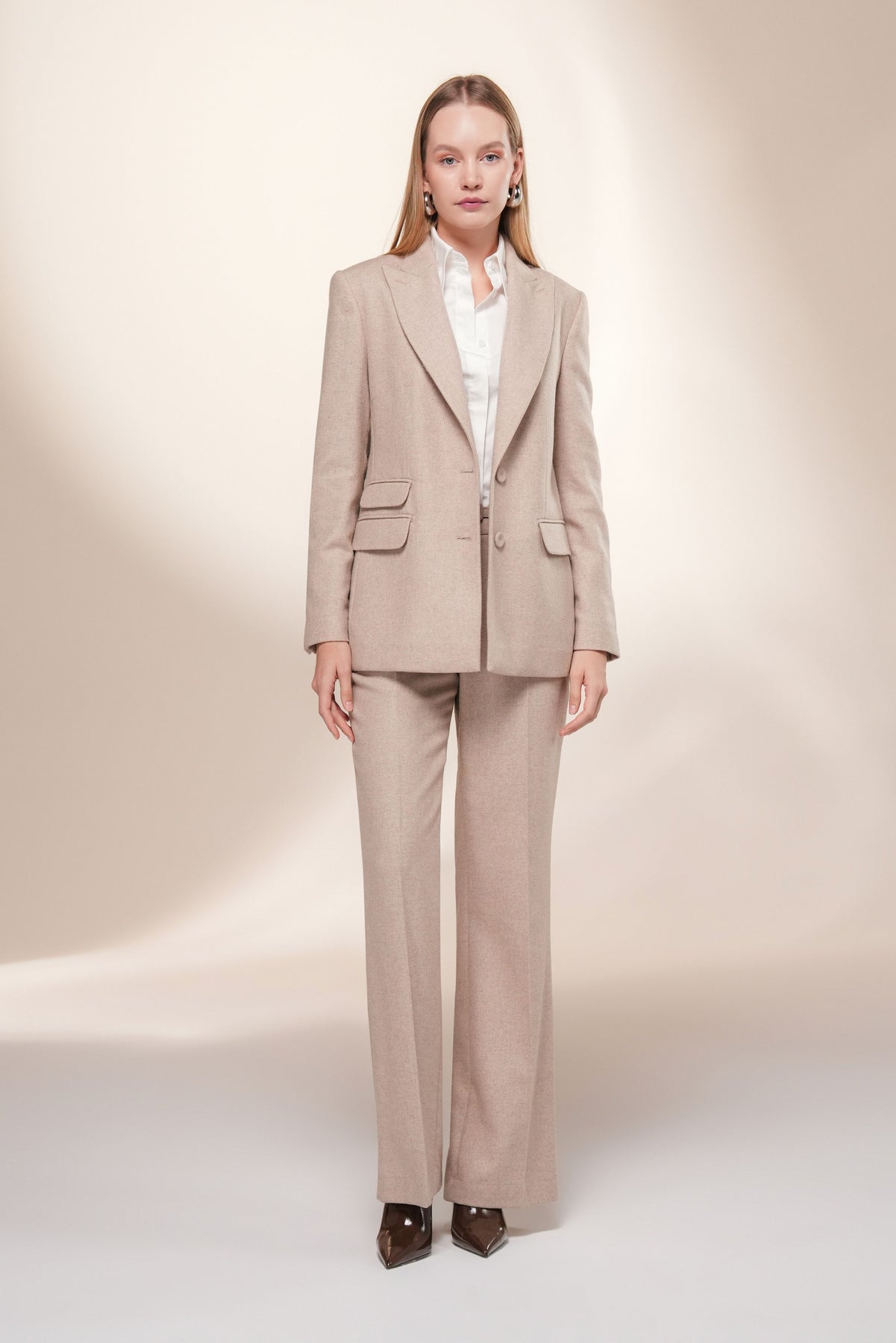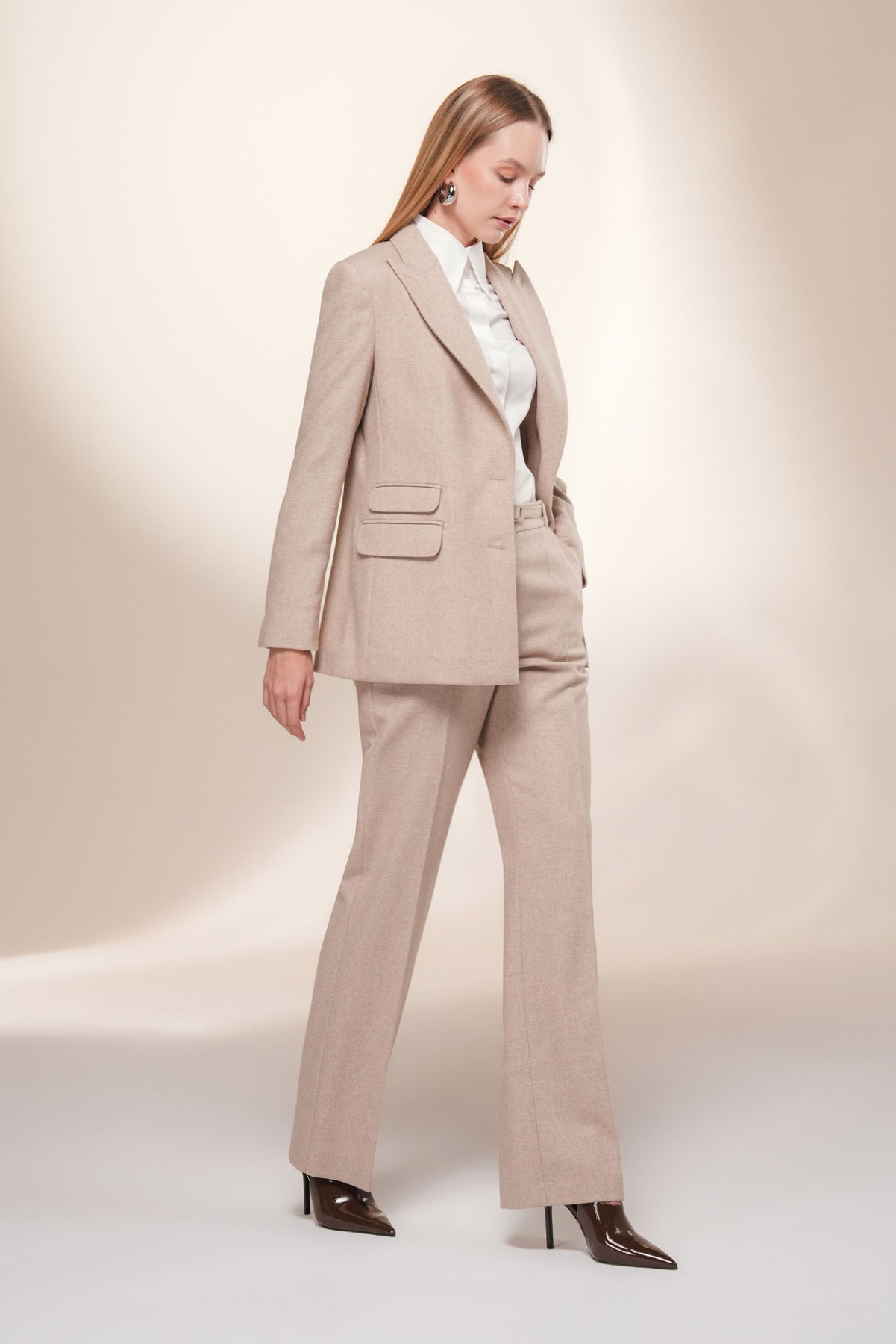Çift kapaklı cep detaylarına sahip asimetrik yün ceket ve uyumlu pantolon ile tamamlanan takım.
